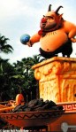 By the time the pumpkin mountain was Tarzan swung below the catwalk and put into place, it had been chipped up pretty bad, so John had to spend several weeks to repaint and repair it. The problem with the mountain, was, it’s situated in the pit where the projectors are. The tallest ladder they had that would fit in that area only got John halfway up the mountain, so he’d need to get a 15 foot pole to attach his paint brush to so that he would then be able to paint the areas located at the top half of the mountain.