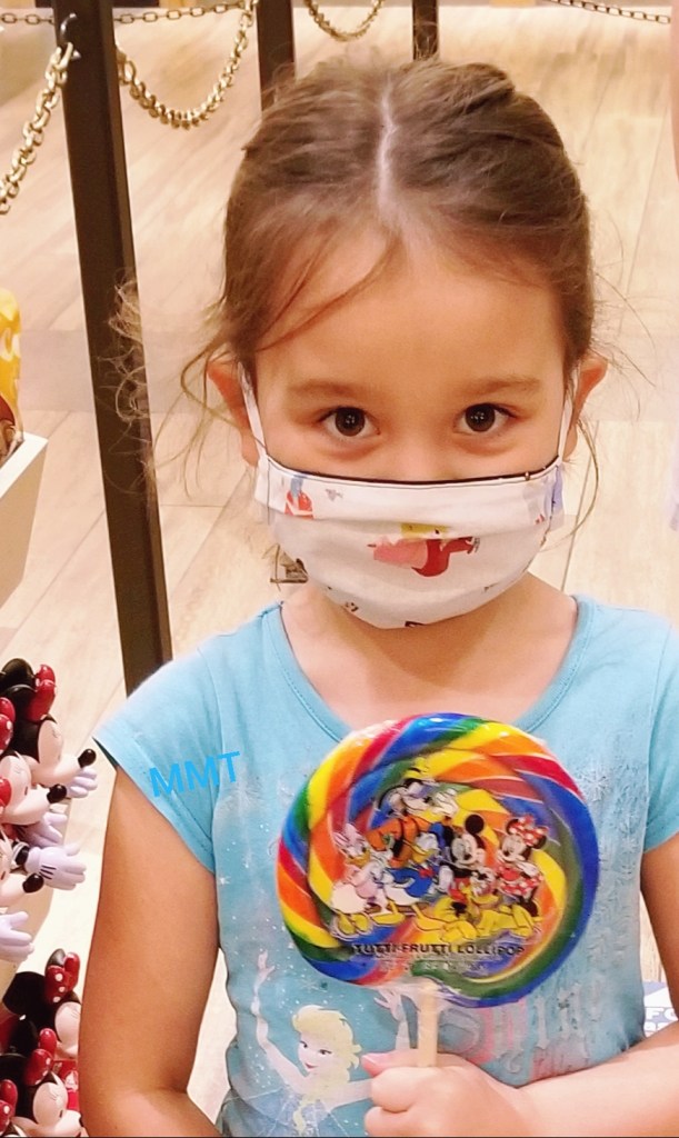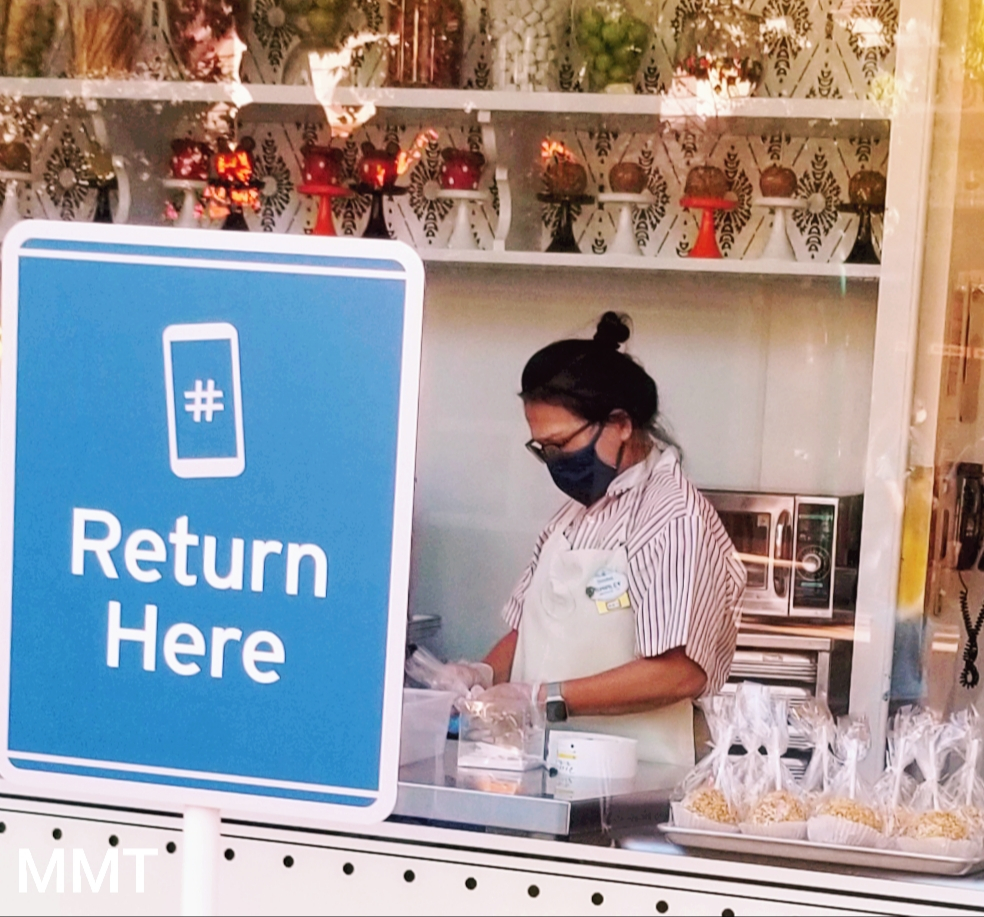 Visitors may remove their masks only while actively eating and drinking outdoors in a stationary position while maintaining social distancing. To reiterate, if you want to drink your beverage or lick your ice cream cone, you must do so while sitting or standing in one location. You may not eat and drink as you walk throughout Downtown Disney.