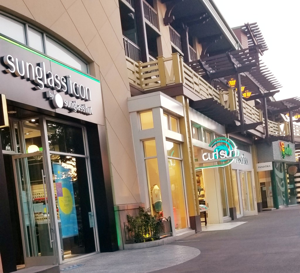 Asian Street Eats, Ballast Point Brewery and Kitchen, Black Tap Craft Burgers and Shakes, California Churro, California Sole, Curl Surf, Disney Home, Disney’s Pin Traders, Earl of Sandwich, Jamba, Kayla’s Cakes, La Brea Bakery, Marceline’s Confectionery, Naples Ristorante e Bar, PANDORA jewelry, Ralph Brennan’s Jazz Kitchen, Rinse Bath & Body Co., Salt & Straw, Sephora, Starbucks (2 locations), Sugarboo & Co., Sunglass Icon, The Disney Dress Shop, The LEGO Store, Tortilla Jo’s, Uva Bar and Cafe, Wetzel’s Pretzels, WonderGround Gallery, World of Disney.